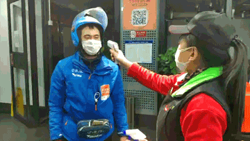 为每一位配送员测量体温,对骑手、餐箱、配送箱、站点等消毒措施已全面升级。
