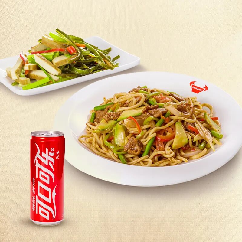 2、孜然肉炒面+凉菜素拼+可乐单人套餐