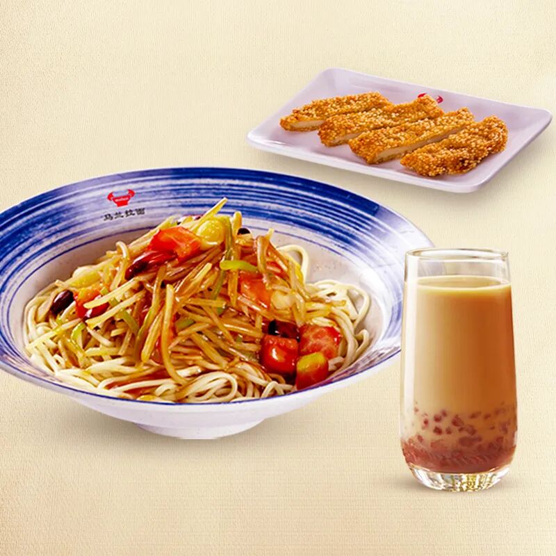 4、土豆丝炒面+藤椒鸡排+红豆奶茶单人套餐